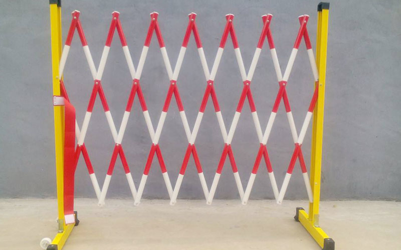 伸縮護(hù)欄筒由不銹鋼管制成,伸縮護(hù)欄底座由鑄鐵制成。圍欄的兩條絲帶上有“止步, 高壓危險(xiǎn)”標(biāo)志;絲帶可以自由拉出,并可自動(dòng)收回。